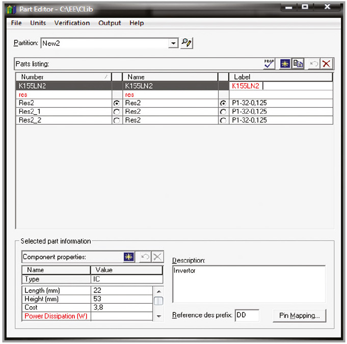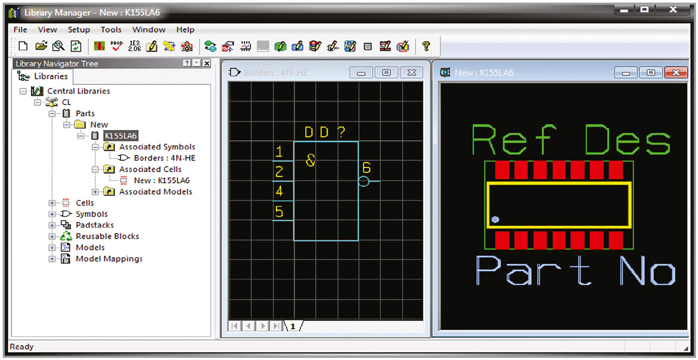 Редактор Part Editor предоставляет инструментальные средства для создания, удаления и редактирования компонентов в ЦБ. Компонент содержит информацию, которая связывает условное графическое обозначение с посадочным местом электрорадиоэлемента по свойству Part Number (номер компонента). Каждый номер компонента должен быть уникальным внутри ЦБ и может состоять из 32 символов. Кроме того, компонент можно идентифицировать в библиотеке по имени (Part Name) или по метке компонента (Part Label). В ЦБ компоненты сгруппированы в разделы. С компонентами можно производить операции импорта и экспорта. Типичный компонент – это набор взаимосвязанной конструкторской, технологической и схемотехнической информации об электрорадиоэлементе, который монтируется на печатной плате. Этот набор содержит: