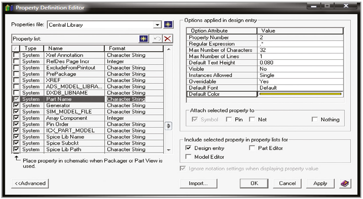 При помощи установки флажков в чекбоксах в поле Include selected property in property lists for есть возможность включить выбранное свойство в список свойств для редактора моделей (Model Editor), редактора компонентов (Part Editor) или редактора схем (Design entry).