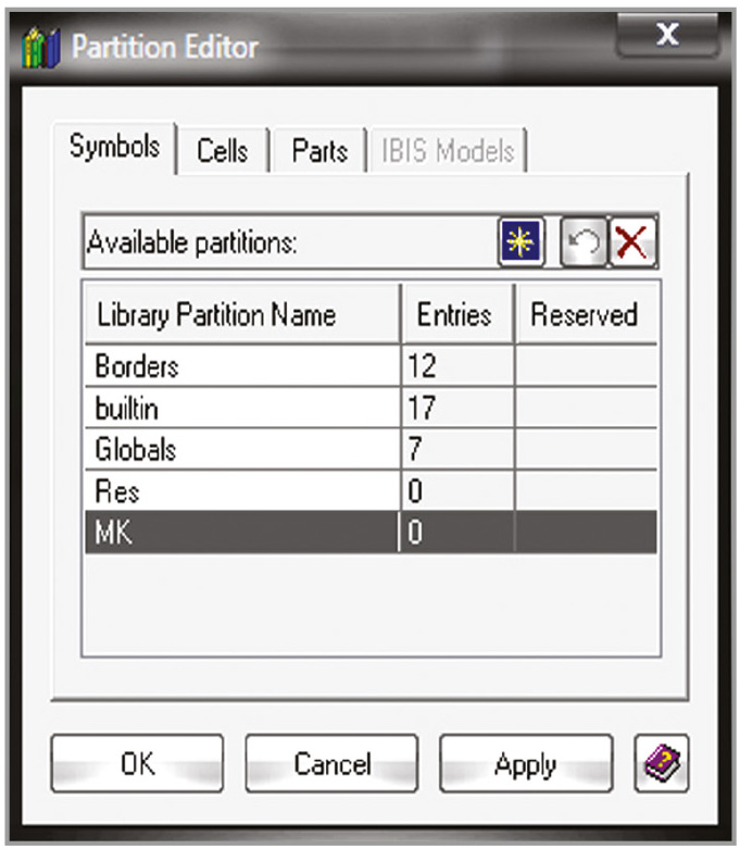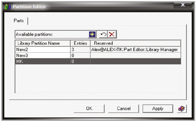 Рассмотрим окно Part Editor более подробно. В верхней части находится поле Partition, в котором из выпадающего списка можно выбрать раздел для работы с компонентами или же создать новый раздел при помощи кнопки Partition Editor, находящейся в этом же поле. После нажатия на кнопку Partition Editor открывается одноимённое диалоговое окно (см. рис. 8), в котором отображаются названия доступных библиотечных разделов (Library Partition Name), количество компонентов в каждом из разделов (Entries), резервирование (Reserved). Поле Available partitions (доступные разделы) содержит три кнопки: New Partition (новый раздел), Delete Partition (удалить раздел) и Undo Delete (отменить удаление), при помощи которых можно создавать новые разделы компонентов в ЦБ или удалять их. Для вступления в силу произведённых изменений необходимо нажать на кнопку Apply или ОК, для выхода из окна Partition Editor без сохранения – нажать кнопку Cancel.