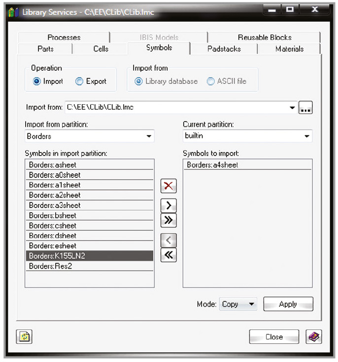 Рассмотрим интерфейс вкладки в случае, когда переключатель установлен в положение Import (см. рис. 5). В верхней правой части вкладки Symbols расположено поле Import from (импортировать из), которое содержит переключатели Library database (библиотечная база данных) и ASCII file (ASCII файл). Под полем Operation находится поле Import from – поле выбора библиотеки, из которой будет производиться импорт. Выбор библиотечного файла производится при помощи кнопки Browse поля Import from. Ниже этого поля находятся два выпадающих списка: Import from partition (импорт из раздела) и Current partition (текущий раздел), в которых из выпадающего меню можно выбрать необходимые разделы. Поле Symbols in import partition содержит список символов, доступных для выполнения операции импорта. В нижней части вкладки в поле Mode задаётся режим импорта: Copy (копирование) или Move (перемещение). Для выполнения операции импорта необходимо при помощи левой кнопки мыши выбрать из списка в поле Symbols in import partition необходимый символ и при помощи кнопки Include Selected (произвести выбор) переместить его в поле Symbols to import (символы для импорта). Для импорта всех символов раздела одновременно предназначена кнопка Include All (выбрать все). Удалить символы (посадочные места, стеки контактных площадок) можно при помощи кнопки Display Delete Dialog.