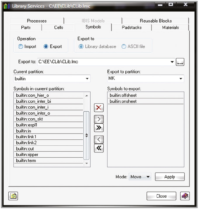 Рассмотрим интерфейс вкладки Symbols в случае, когда переключатель в поле Operation установлен в положение Export (см. рис. 6). В верхней правой части вкладки расположено поле Export to (экспортировать в), которое содержит переключатели Library database (библиотечная база данных) и ASCII file (ASCII файл). Под полем Operation находится поле Export to, с помощью которого производится выбор библиотеки для экспорта в неё новых разделов. Выбор библиотечного файла производится при помощи кнопки Browse поля Export to. Ниже этого поля находятся два выпадающих списка: Current partition (текущий раздел) и Export to partition (экспорт в раздел), в которых из выпадающего меню можно выбрать необходимые разделы. Поле Symbols in current partition содержит список символов, доступных для выполнения операции экспорта. В нижней части вкладки в поле Mode задаётся режим экспорта: Copy (копирование) и Move (перемещение). Для того чтобы выполнить операцию экспорта, нужно при помощи левой кнопки мыши выбрать из списка в поле Symbols in current partition необходимый символ и при помощи кнопки Include Selected (произвести выбор) переместить его в поле Symbols to export (символы для экспорта).