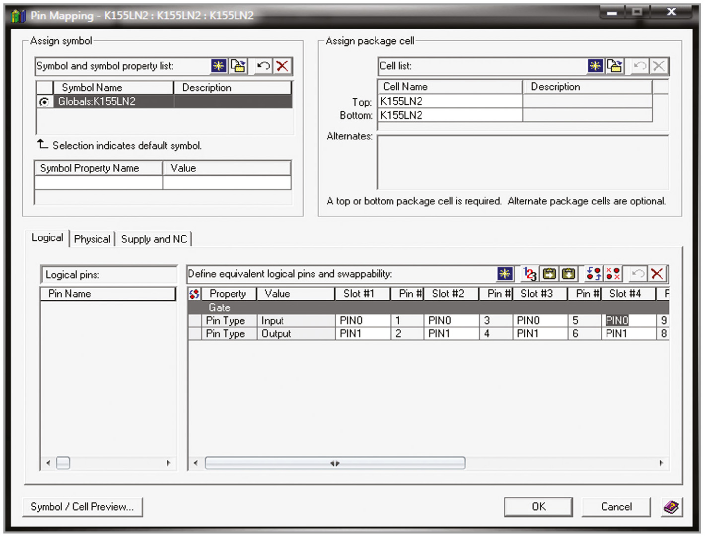 7) определение соответствия имён выводов символа и номеров выводов корпуса (вкладки Logical, Physical, Supply and NC окна Pin Mapping);