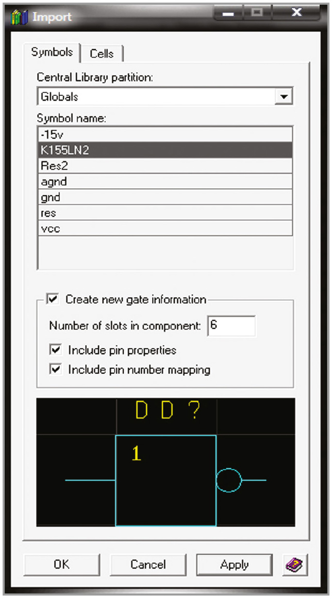 Количество вентилей в компоненте задаётся путём ввода с клавиатуры числового значения в поле Number of slots in component. Флажок в чекбоксе Include pin properties устанавливается в том случае, если есть необходимость автоматически назначать выводам компонента те же свойства, что и в символе. Флажок в чекбоксе Include pin number mapping устанавливается при необходимости автоматически назначать физические номера выводов при импорте символа.