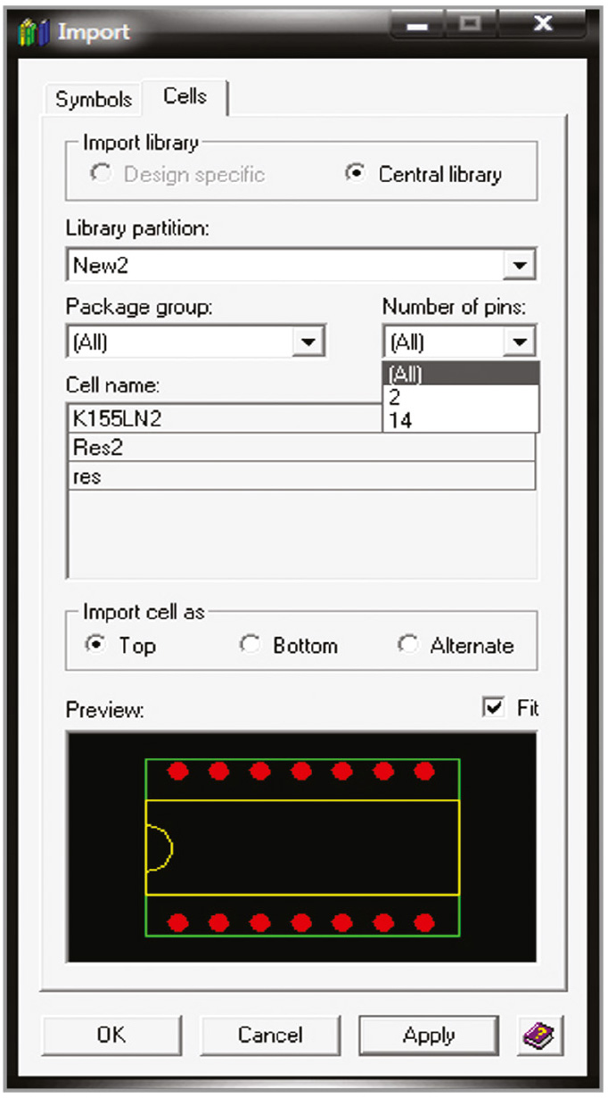 После нажатия на кнопку Import откроется одноимённое окно, изображённое на рисунке 11. Для импорта посадочных мест из ЦБ необходимо использовать вкладку Cells. В верхней части вкладки находится поле Library partition (раздел ЦБ), в котором из выпадающего списка необходимо выбрать нужный раздел. Тип корпуса компонента и количество выводов можно задать при помощи выпадающего меню в полях Package group и Number of pins, соответственно. После того как данные параметры выбраны, в поле Cell name (название посадочного места) отобразится список всех имеющихся посадочных мест, соответствующих заданным критериям. Выбрать нужное посадочное место из списка можно при помощи левой кнопки мыши, после чего это посадочное место визуально отобразится в нижней части окна Import. Также в окне Import в поле Import cell as (импортировать посадочное место как) есть возможность посредством установки переключателя в нужную позицию назначить посадочное место в верхний (Top) или нижний (Bottom) слой или как альтернативное (Alternate).