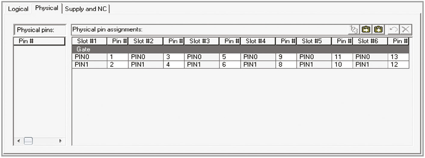 Slot (слот) – это один экземпляр логического вентиля. В рассматриваемой таблице каждый слот представлен двумя столбцами (Slot и Pin). Столбец Slot содержит названия выводов символа в слоте. Столбец Pin содержит физические номера выводов в слоте (на вкладке Logical этот столбец не редактируется).