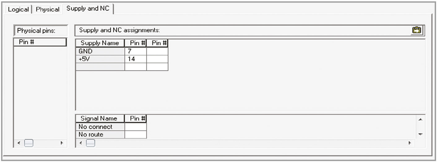 В нижней части окна Pin Mapping находится три вкладки (Logical, Physical, Supply and NC), при помощи которых производится определение соответствия имён выводов символа и номеров выводов корпуса. Рассмотрим вкладку Logical (логические имена выводов).