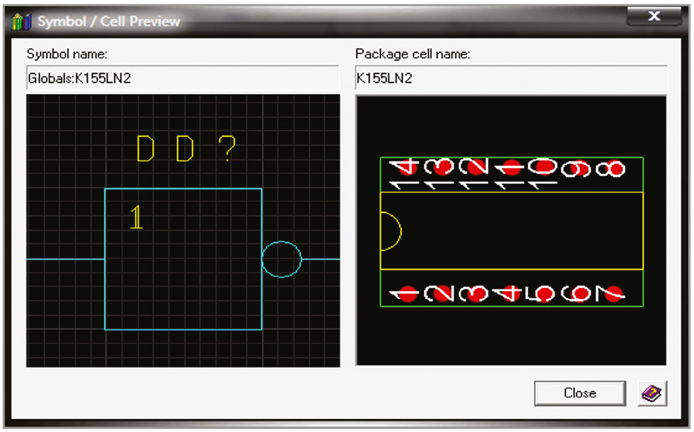 В нижней левой части окна Pin Mapping находится кнопка Symbol / Cell Preview, после нажатия на которую открывается одноимённое окно, отображающее обе составные части созданного компонента (см. рис. 14). Проделанные в диалоговом окне Pin Mapping изменения нельзя сохранить до тех пор, пока не будут назначены все логические имена и физические номера выводов компонента. Закончить работу с рассмотренным диалогом можно при помощи кнопки ОК.