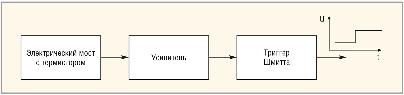 Наиболее распространённым преобразователем сопротивления в напряжение является мостовая резистивная схема с NTC-термистором в одном плече. Мост сбалансирован при заданной температуре. При повышении/понижении температуры сопротивление термистора уменьшается/увеличивается и появляется напряжение разбаланса, которое усиливается и поступает на схему, вырабатывающую сигнал управления (скачок напряжения), например триггер Шмитта (см. рис. 1). Электронная часть мостового датчика температуры, как правило, реализована в виде специализированной ИС.