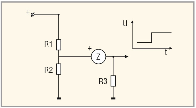 Как уже было отмечено, Z-термисторы могут работать как при постоянном напряжении питания, так и переменном практически любой формы. Рассмотрим несколько вариантов включения Z-термисторов при различных видах питающего напряжения. Схема включения для постоянного напряжения питания, принципиально обладающая большим температурным гистерезисом, достигающим десятков градусов Цельсия, приведена на рисунке 2.