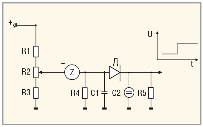В схеме, показанной на рисунке 3, использован частотный режим работы Z-термистора [6, 7]. При подключении ёмкости С1 параллельно нагрузочному резистору R4 Z-термистор начинает генерировать импульсы при достижении заданной температуры. Далее через разделительный диод D они поступают на сглаживающий фильтр R5С2 и в виде скачка напряжения в несколько вольт – на выход схемы управления. Частотный режим работы Z-термистора также может быть использован для формирования цифрового управляющего сигнала.