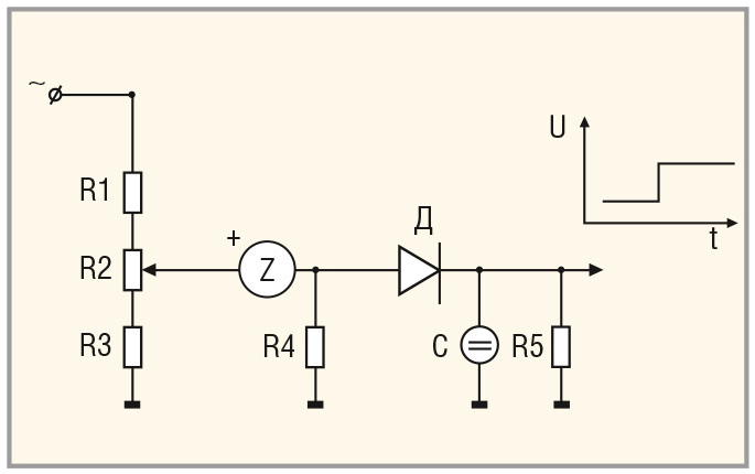 На рисунке 4 приведена схема включения Z-термистора при использовании синусоидального напряжения. В данном случае Z-термистор работает от положительной полуволны напряжения, не реагируя на отрицательную. При значении температуры, соответствующей установленной амплитуде синусоидального напряжения, на вершинах полуволн синусоиды Z-термистор срабатывает, и на нагрузочном резисторе возникают прямоугольные импульсы напряжения. Сглаживающим фильтром R5С последовательность импульсов преобразуется в управляющий скачок напряжения.