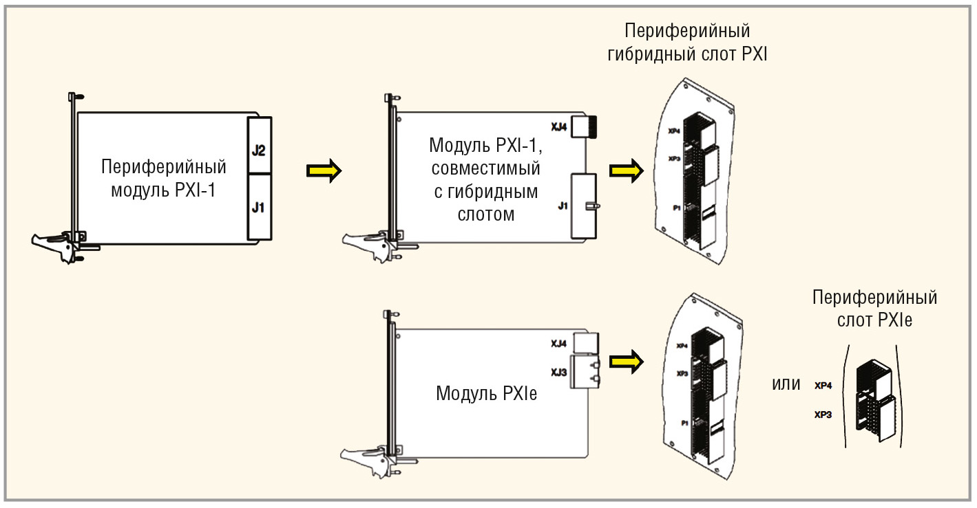 - модули PXI-1, совместимые с гибридным слотом, оснащены разъёмами J1 (снизу) и XJ4 (сверху);