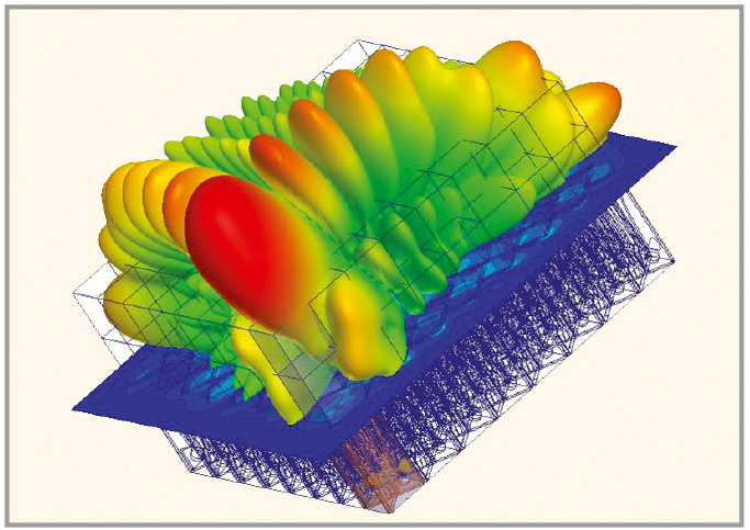 1. ANSYS HFSS Frequency – расчёт задач в частотной области методом конечных элементов (FEM, Finite Element Method). Данный метод содержит прямой и итерационный матричный решатель. Пользователям предоставляется возможность выполнить расчёт паразитных параметров (S, Y, Z), отобразить трёхмерную диаграмму распределения электромагнитного поля в ближней и дальней зонах, создать модели для эффективной оценки качества сигнала, рассчитать потери в линиях передачи, в том числе связанные с отражением сигнала, обусловленным рассогласованием импеданса, и влиянием паразитных связей. На рисунке 1 представлен пример расчёта диаграммы направленности антенной решётки, состоящей из антенн Вивальди.