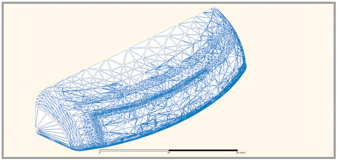 Программный пакет ANSYS HFSS использует сетку с конечными элементами в виде тетраэдров для поиска решения исследуемой электромагнитной задачи [2, 3]. Адаптивный метод разбиения позволяет создавать геометрически оптимальную сетку для любого объекта моделирования. Сетка может состоять из элементов нулевого, первого или второго порядков, а также иметь области с элементами разных порядков. Последний вариант сетки наиболее эффективен с точки зрения расчётов. С его помощью можно описать любую криволинейную поверхность, благодаря чему достигается высочайшая точность описания геометрии всего трёхмерного объекта без аппроксимаций или двухмерного округления. На рисунке 5 представлен пример конформной криволинейной аддитивной сетки разбиения.