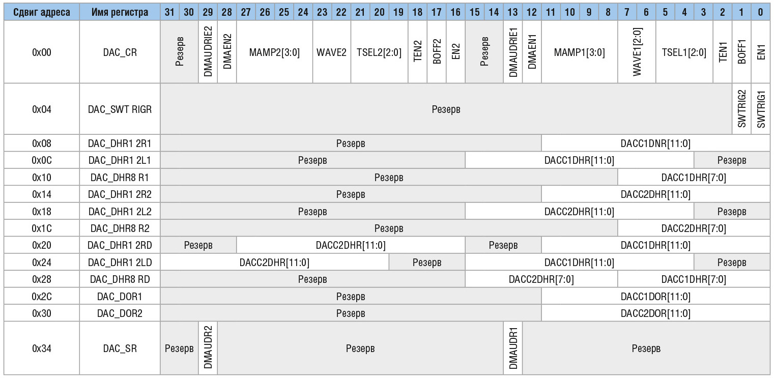 Структура регистров для второго канала ЦАП DAC_DHR12R2, DAC_DHR12L2 и DAC_DHR8R2 такая же, как и для первого.