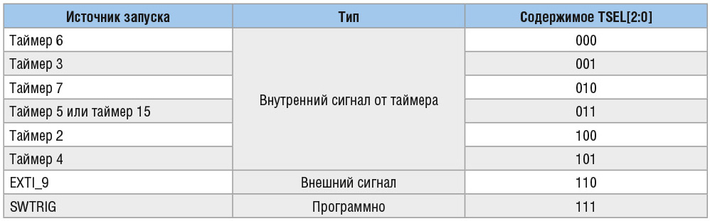 Если управляющий разряд TENx установлен, включается внешний запуск преобразования от таймера или внешнего вывода контроллера. С помощью разрядов TSELx[2:0] выбирается источник запуска, как показано в таблице 2.