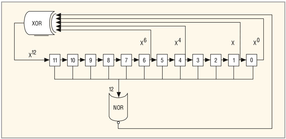 Для генерирования шума доступен регистр LFSR (Linear Feedback Shift Register). Генератор шума выбирается установкой разрядов WAVEx[1:0] = 01. Предустановленное значение регистра LFSR равно 0xAAA. Этот регистр обновляется спустя три такта APB1 после каждого внешнего запуска, после выполнения специального алгоритма вычисления сигнала шума, который приведён на рисунке 4.
