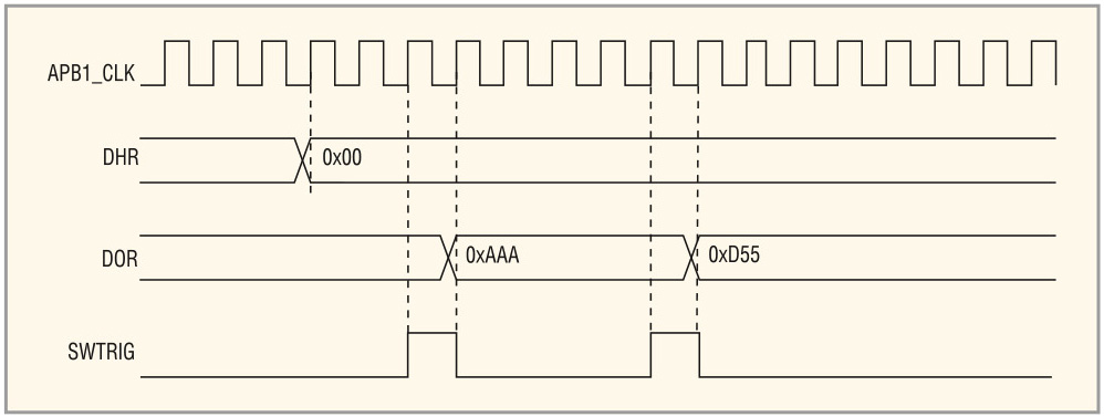 Когда появится сигнал запуска канала 1, данные из регистра DHR1 будут перенесены в регистр DAC_DOR1. Когда появится сигнал запуска канала 2, данные из регистра DHR2 будут перенесены в регистр DAC_DOR2. Перенос данных происходит через три такта APB1.