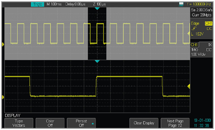 Обработка сигнала осуществляется с применением инновационной технологии аналогового послесвечения SPO (Super Phosphor Oscilloscope). Она обеспечивает плавную регулировку яркости осциллограмм, характерную для аналоговых осциллографов. Также эти осциллографы имеют эффективную функцию выделения участка осциллограммы и увеличения её размеров – Zoom (см. рис. 2). Она действует как «лупа времени», но с присущей цифровым приборам точностью.