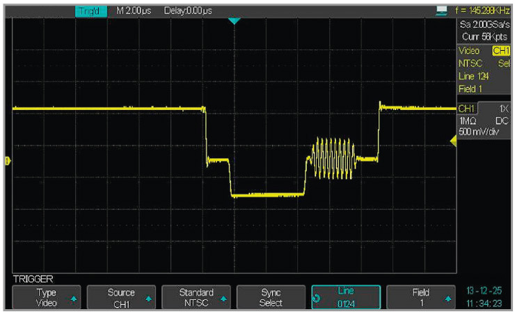 Осциллографы серии АКИП реализуют также эффективную развёртку видео- и телевизионных сигналов с выбором стандарта сигнала, номера полукадра, номера строки и нужного участка осциллограммы. На рисунке 4 показана осциллограмма части сигнала одной из строк, на которой довольно отчётливо видна вспышка цветовой поднесущей.