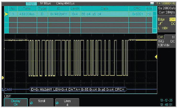 Обычно в бюджетных осциллографах декодирование последовательных данных в шинах не предусмотрено. Однако в описываемых осциллографах оно реализовано, что существенно расширяет области их возможного применения. Режим декодирования предусмотрен для протоколов последовательных шин I2C, SPI, UART/RS-232, CAN, LIN. Пример декодирования последовательной шины CAT показан на рисунке 5.