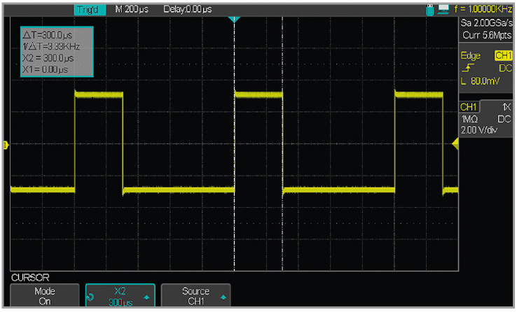Осциллографы имеют развитые средства для проведения автоматических измерений и математической обработки сигналов. Возможны курсорные измерения (ДU, ДT, 1/ДT) с горизонтальной и вертикальной парой курсоров. На рисунке 6 показан пример применения вертикальных курсоров для измерения длительности импульсов.