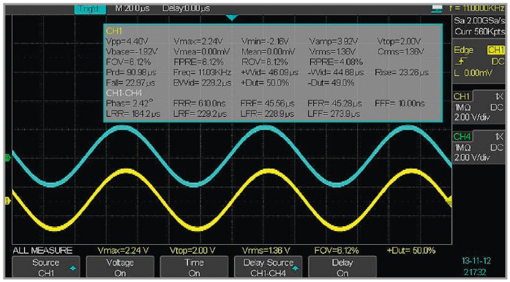 Осциллограф имеет 32 вида автоматических измерений. По вертикали можно автоматически измерять Uпик-пик, Uампл, Uср.кв, –U, +U, Uмакс., Uмин., Uсред., выбросы на вершине и в паузе, по горизонтали Uпик-пик, Uампл, Uср.кв, –U, +U, Uмакс., Uмин., Uсред, выбросы на вершине и в паузе. Кроме того, по горизонтали автоматически измеряются восемь параметров: f, T, t нарастания, t среза, +ф, –ф, коэффициент заполнения (%), фаза, задержка. На экране отображается таблица с результатами всех произведённых автоматических измерений (см. рис. 7). Следует отметить, что столь большое число автоматических измерений характерно для осциллографов высокого класса.