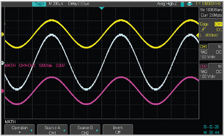 В осциллографах АКИП 4126 предусмотрены также средства математической обработки сигналов. При включённой статистике автоматических измерений в их таблице для каждого измерения указывается текущее, среднее, максимальное и минимальное значения, а также среднеквадратичное отклонение. Для сигналов двух каналов возможны арифметические операции суммирования (см. рис. 8), вычитания, умножения и деления.