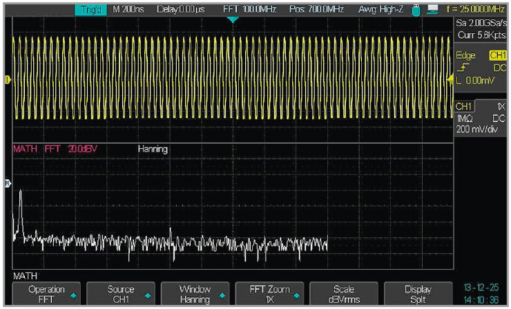 Ряд математических операций возможен для осциллограммы с одного канала – это вычисление квадратного корня, дифференцирование и интегрирование. Функция БПФ реализует получение частотного спектра сигнала методом быстрого преобразования Фурье (см. пример на рис. 9).