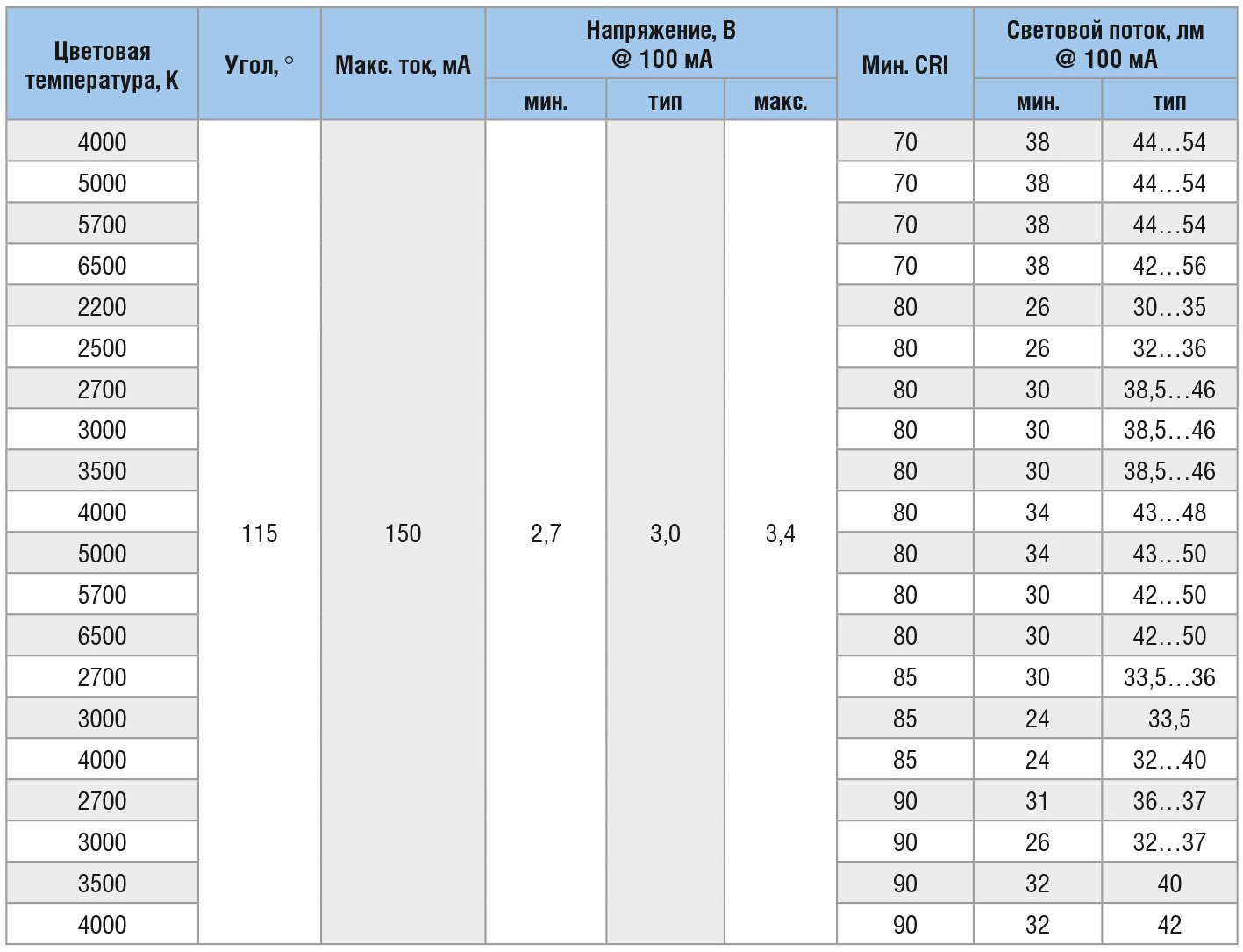 При минимальном значении CRI = 80 в холодном диапазоне белого цвета при значениях цветовой температуры 5700 и 6500 K минимальное значение светового потока в номинальном режиме составляет 9,5 лм, при значении цветовой температуры 5000 K, а также в естественном белом диапазоне (значение цветовой температуры 4000 K) минимальное значение светового потока в номинальном режиме равняется 10 лм. Типичные значения светового потока указанных светодиодов при номинальном токе соответственно составляют 11,5 и 12 лм. В тёплом белом диапазоне для значений цветовой температуры 2200, 2500, 2700 и 3000 K минимальное значение светового потока в номинальном режиме составляет 8,5 лм. Типичные значения светового потока указанных светодиодов при номинальном токе соответствуют 9,7, 10,2, 10,5 и 11 лм. Для значений цветовой температуры 3500 K минимальное значение светового потока в номинальном режиме составляет 9 лм, типичное значение – 11 лм.