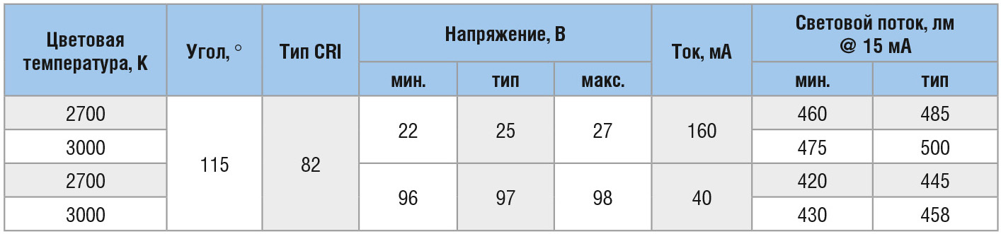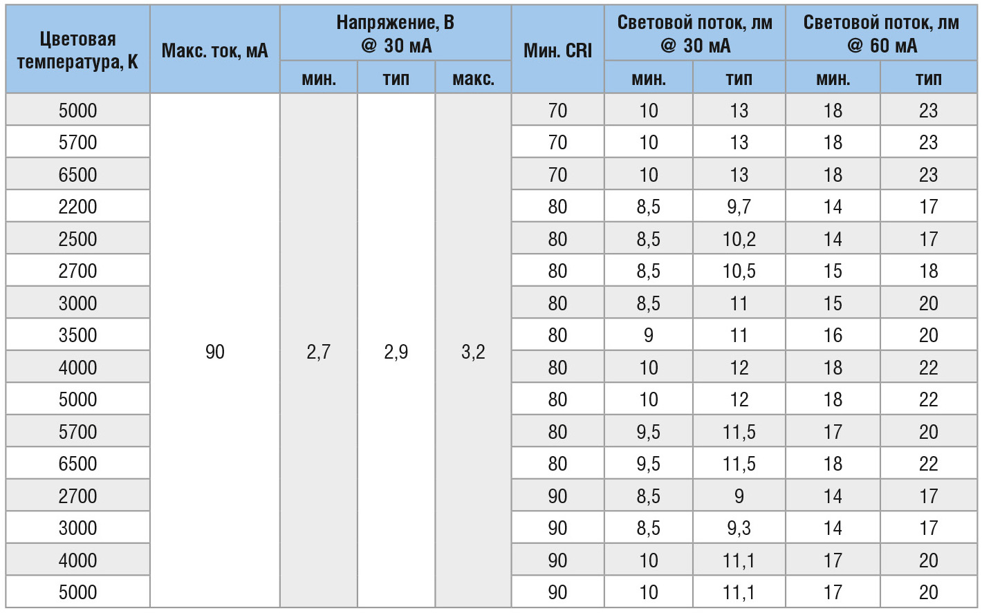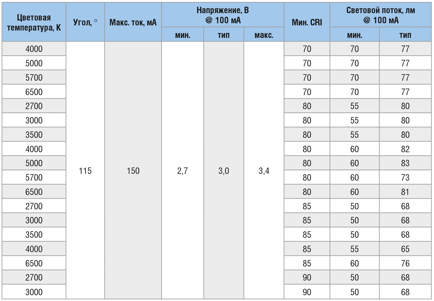 При минимальном значении CRI = 80 в холодном (значения цветовой температуры 5000, 5700 и 6500 K) и естественном (значение цветовой температуры 4000 K) белом диапазонах, минимальное значение светового потока в номинальном режиме тоже составляет 32 лм. Типичное значение светового потока указанных светодиодов при номинальном токе равно 36 лм. В тёплом белом диапазоне для значения цветовой температуры 2700 K минимальное значение светового потока в номинальном режиме составляет 28 лм, для значений цветовой температуры 3000 и 3500 K – 30 лм. Типичное значение светового потока для указанных значений цветовой температуры составляет 32, 33 и 34 лм соответственно.