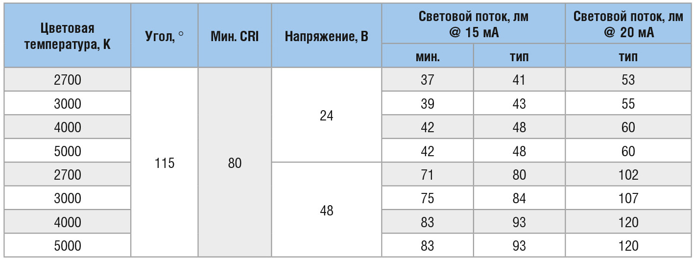 Данные светодиоды перекрывают диапазон цветовой температуры от 2700 до 5000 K и представляют все оттенки белого света – тёплый, естественный и холодный. Минимальный индекс цветопередачи CRI = 80, угол кривой светораспределения – 115°. Тепловое сопротивление для моделей с рабочим напряжением 24 В составляет 25°C/Вт, для моделей с рабочим напряжением 48 В – 14°C/Вт.