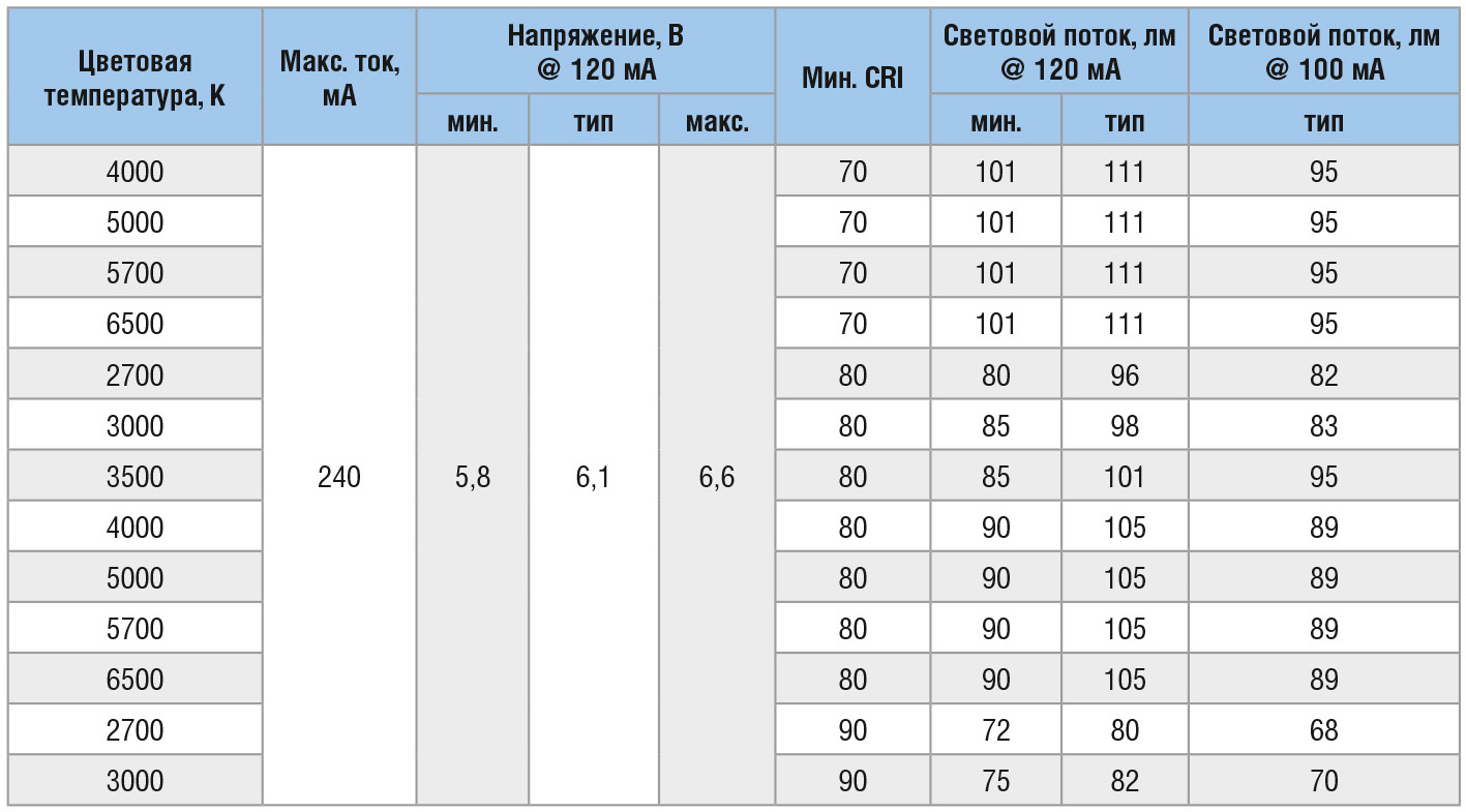 При минимальном значении CRI = 80 в холодном (значения цветовой температуры 5000, 5700 и 6500 K) и естественном (значение цветовой температуры 4000 K) белом диапазонах минимальное значение светового потока в номинальном режиме составляет 90 лм. Типичное значение светового потока указанных светодиодов при номинальном токе – 105 лм. В тёплом белом диапазоне для значения цветовой температуры 2700 K минимальное значение светового потока в номинальном режиме составляет 80 лм, для значений цветовой температуры 3000 и 3500 K – 85 лм. Типичное значение светового потока для указанных значений цветовой температуры равняется 96, 98 и 101 лм соответственно.