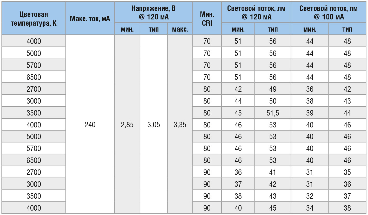 При минимальном значении CRI = 85 в холодном белом диапазоне (значение цветовой температуры 6500 K) минимальное значение светового потока в номинальном режиме составляет 60 лм, типичное значение светового потока указанных светодиодов при номинальном токе равняется 76 лм. В естественном белом диапазоне (значение цветовой температуры 4000 K) минимальное значение светового потока в номинальном режиме составляет 55 лм, типичное значение светового потока указанных светодиодов при номинальном токе – 65 лм. В тёплом белом диапазоне (значения цветовой температуры 2700, 3000 и 3500 K) минимальное значение светового потока в номинальном режиме составляет 50 лм, типичное значение светового потока данных светодиодов в номинальном режиме – 68 лм.