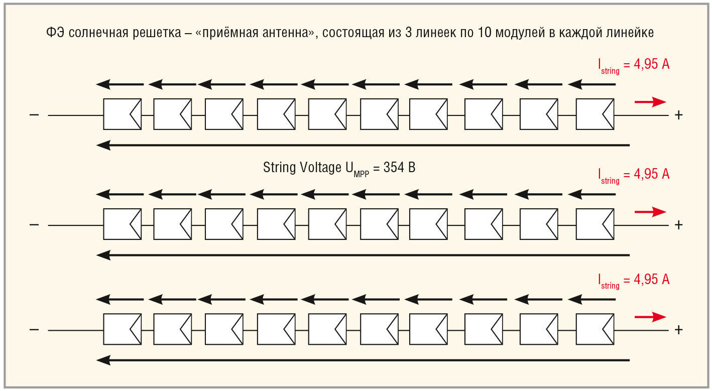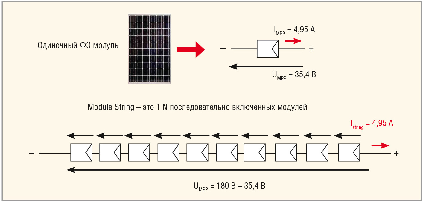 Для увеличения выходного напряжения и выходной мощности фотоэлектрические модули включают в последовательную и параллельную электрическую цепь – String (линейка последовательно включённых ФЭ-модулей). Благодаря такому включению можно получить выходное напряжения (String Voltage, UMPP) в диапазоне 180…354 В при токе (Istring) в нагрузке до 5 A. На рисунке 5 показана структурная схема соединения ФЭМ в последовательную электрическую цепь (параметры для одиночного ФЭ-модуля актуальны при температуре окружающей среды 25°C и солнечной радиации 1000 Вт/м2).