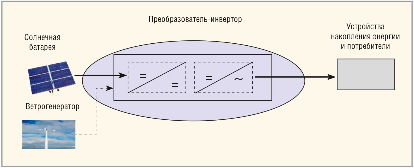 Например, линейные инверторы для автономных объектов имеют выходную мощность до 22 кВт (при КПД 97,3%), что позволяет обеспечить питание отдельного дома или фермерского хозяйства. На рисунке 7 показана блок-схема подключения инвертора в системе автономного энергоснабжения. Цена такого оборудования для частного потребителя составляет 60…80 тыс. руб. Интересно, что даже в Финляндии, на широтах более 60°, автономные системы энергообеспечения на основе преобразователей энергии Солнца и ветра можно встретить повсеместно. Фермеры не экономят на них, поскольку такое оборудование окупается за несколько лет (с учётом стоимости электроэнергии). В России пока такого массового применения ФЭ-установок не наблюдается, особенно в фермерском секторе. Однако интерес к ним есть.
