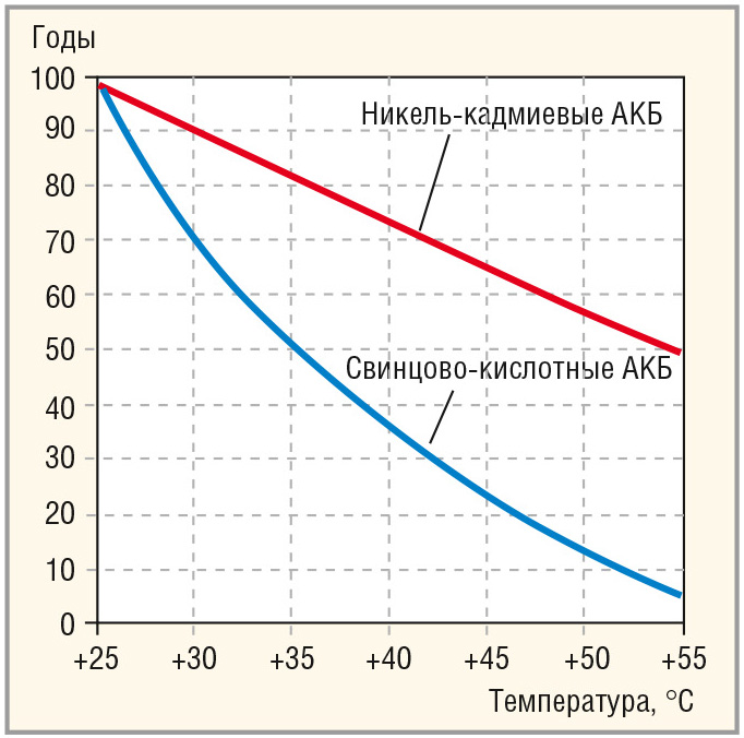 График зависимости срока службы свинцово-кислотных АКБ и NiCd АКБ от температуры эксплуатации представлен на рисунке 9.