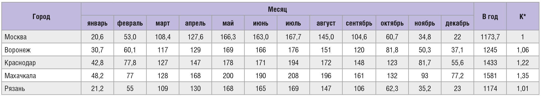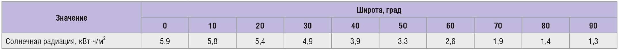 Немаловажным фактором является и то, что максимальный КПД солнечной батареи реализуется, когда солнечные лучи падают на поверхность фотоэлектрических элементов и модулей перпендикулярно. В других случаях эффективность батареи снижается. В ясную погоду на 1 м2 земной поверхности в среднем падает 1000 Вт световой энергии Солнца. В зависимости от местонахождения участка земли, солнечная энергия поступает неравномерно из-за облачности. Кроме того, есть места, где солнце светит 320–350 дней в году, и есть места, где появление солнца является праздником. Исходя из этого, необходимо оценивать эффективность применения системы в каждом конкретном случае. В таблице 1 приведены сведения о солнечной радиации в некоторых городах России. Таблица построена по данным спутников NАSА (по состоянию на 2015 г.).