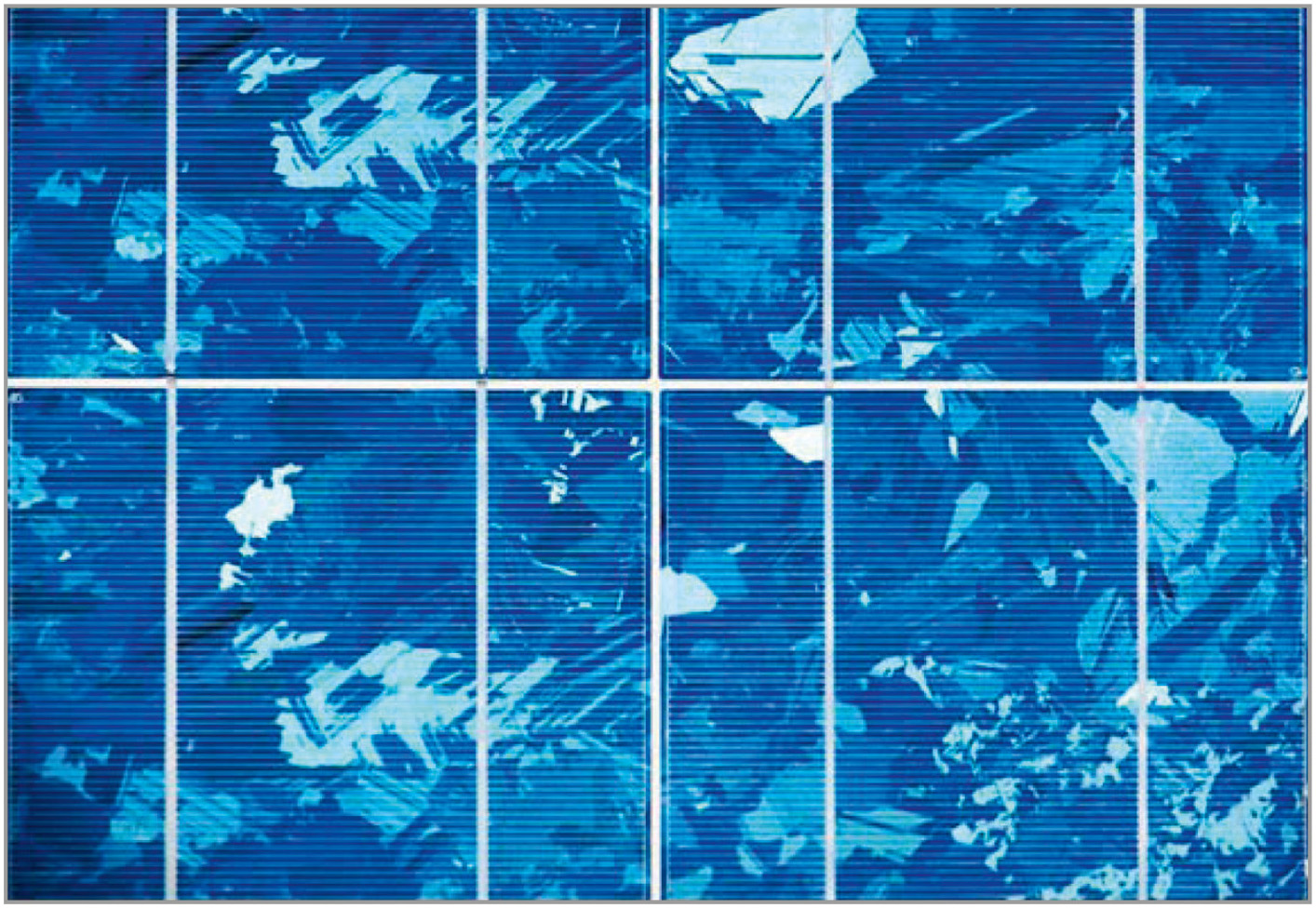 Модуль на основе поликристаллического литого кремния представлен на рисунке 3. Эта технология менее затратная, чем монокристаллическая, что позволяет создавать более дешёвые модули. Более низкое качество материала приводит к пограничным эффектам в виде неоднородностей и зернистости, которые препятствуют эффективному преобразованию солнечной энергии. Тем не менее обеспечивается довольно высокий КПД от 13 до 15% [2].