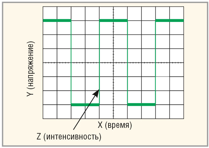 Осциллограф – это графическое устройство, формирующее график электрического сигнала, как правило, временнýю зависимость напряжения. По горизонтальной оси такого графика мы можем наблюдать время, по вертикальной оси – напряжение или, как говорят, осциллограф формирует временну¢ю развёртку сигнала. Используя различную яркость изображения на экране осциллографа, можно графически выразить ещё одну величину исследуемого сигнала – его интенсивность, как показано на рисунке 1.