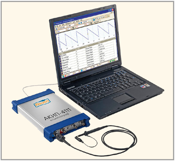 Осциллографы на базе ПК, или как их ещё называют, USB-осциллографы (см. рис. 4), становятся всё более популярными, поскольку они дешевле традиционных. Используя компьютер, они получают большой цветной дисплей, быстрый процессор, возможности сохранения данных на диск и работы на клавиатуре. Другим большим их преимуществом является возможность быстрого экспорта данных в электронные таблицы. Среди USB-приставок часто попадаются настоящие «комбайны», совмещающие несколько устройств в одном корпусе: осциллограф, цифровой анализатор, генератор сигналов произвольной формы и генератор цифровых последовательностей. За удобство и универсальность «комбайнов» приходится расплачиваться худшими характеристиками, нежели у их автономных собратьев.