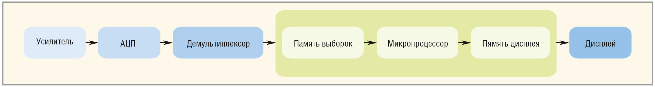 Цифровые запоминающие осциллографы используют архитектуру последовательной обработки для захвата и отображения сигнала на экране, как это показано на рисунке 5.