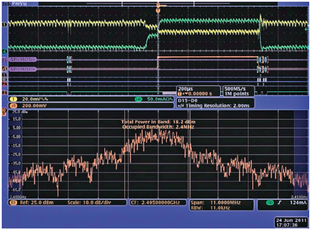 Понимание временно¢й задержки между командой микропроцессора и событием радиочастотного сигнала во встраиваемом устройстве упрощает тестовые настройки и позволяет производить сложные измерения на лабораторном столе. Для встраиваемых радиомодулей, таких как Zigbee, можно производить запуск при появлении радиочастотного события и наблюдать задержку командной строки микроконтроллера, декодирующего управляющие строки SPI, токопотребление и напряжение в момент включения и результирующие спектральные изменения (см. рис. 7).