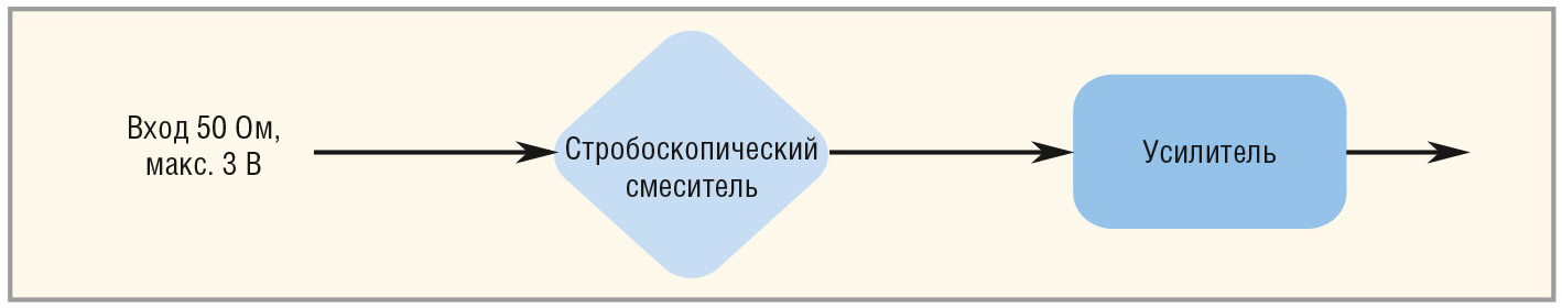В отличие от архитектур цифрового запоминающего осциллографа и осциллографа с цифровым люминофором, архитектура цифрового стробоскопирующего осциллографа использует перестраиваемый аттенюатор/усилитель и стробоскопический смеситель (мост сэмплирования), как это показано на рисунке 9. Выборка входного сигнала осуществляется до того, как производится его ослабление или усиление. После моста дискретизации может использоваться узкополосный усилитель, поскольку сигнал уже преобразован в каскаде сэмплирования, в результате чего значительно повышается пропускная способность прибора.