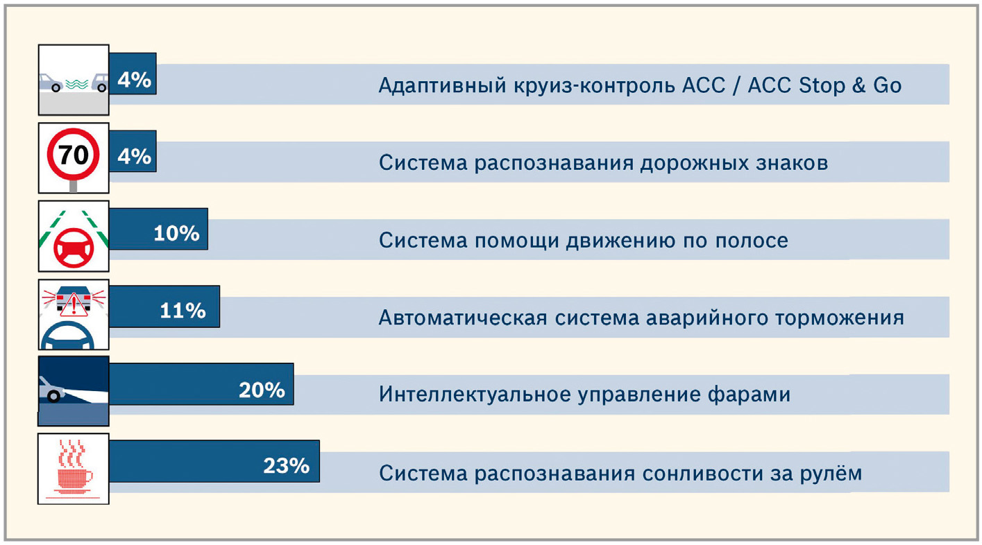 Далее в порядке возрастания перечислены шесть современных систем помощи водителю, наиболее популярных в новых автомобилях (см. рис. 1).