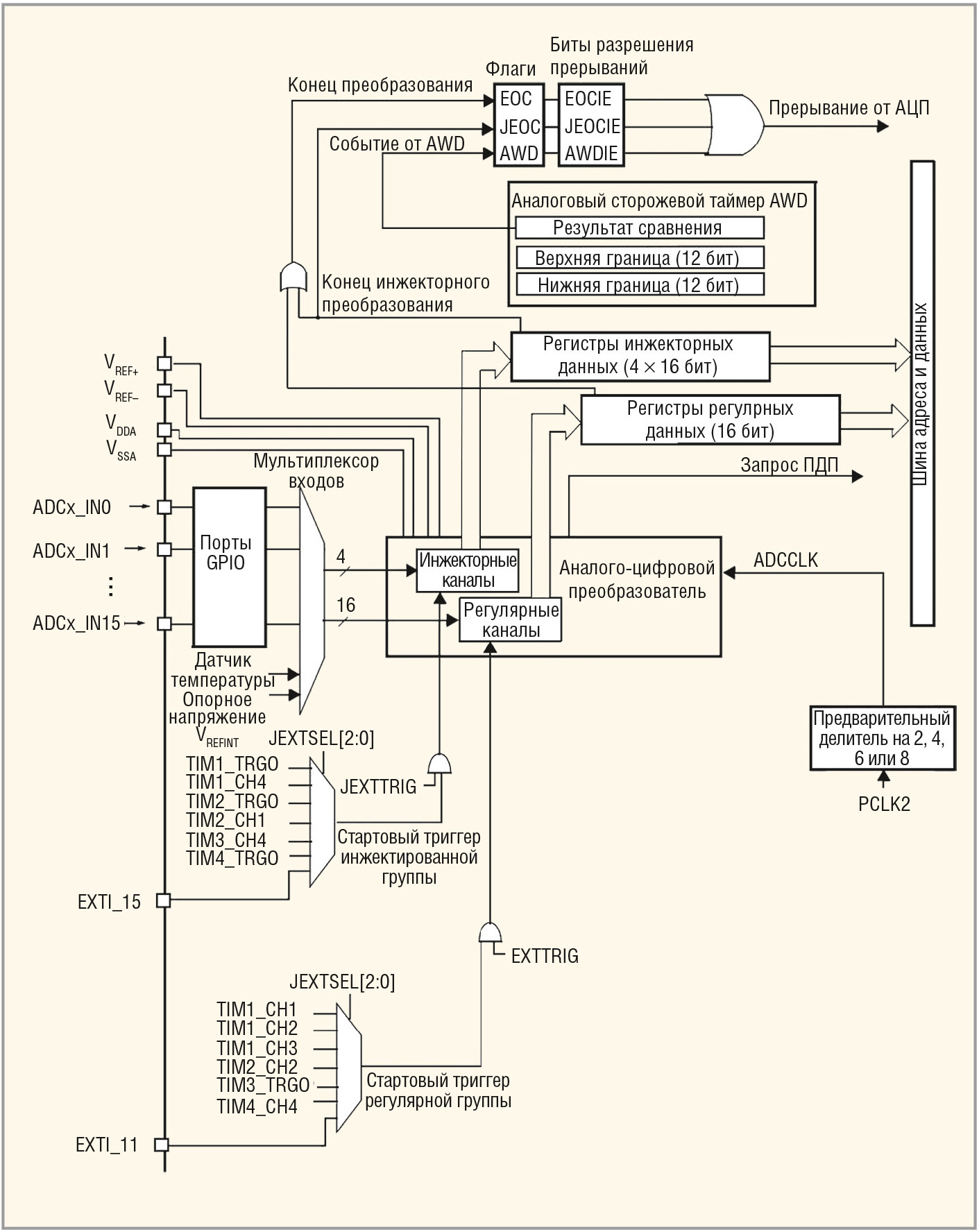 В нижней части схемы, изображённой на рисунке, приведены источники, которые могут запускать процесс преобразования отдельно для регулярной и инжектированной группы каналов. Это могут быть сигналы от таймеров, внешний сигнал или два специальных разряда управляющих регистров, установив которые, можно программно запустить преобразование в регулярной или инжектированной группе.