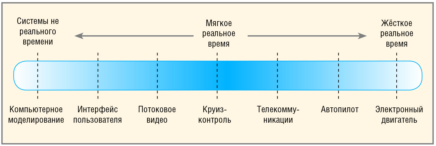 Системы реального времени различаются, и основная особенность каждой из них заключается в том, что произойдёт, если срок реакции системы не выдержан. Например, если система реального времени является частью системы управления полётом самолёта, то жизни пассажиров и членов экипажа может угрожать лишь пропущенная реакция на какое-нибудь отслеживаемое событие. Если же речь идёт о системе спутниковой связи, то результат несвоевременной реакции может быть ограничен одним пропущенным пакетом данных (который может иметь или не иметь катастрофических последствий в зависимости от реализации и схемы восстановления ошибок). Чем тяжелее последствия, тем более вероятно, что время реакции является «жёстким», и такая система является «жёсткой системой реального времени». Системы реального времени с меньшими требованиями для скорости реакции являются так называемыми «мягкими системами реального времени». На рисунке 1 показаны некоторые примеры жёстких и мягких систем реального времени.