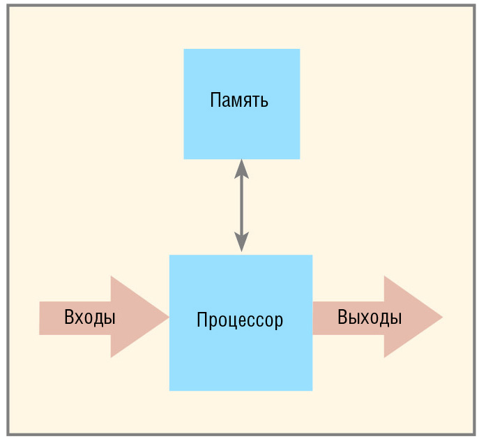 Все встраиваемые системы также содержат некоторые типы входов и выходов. Например, в микроволновой печи входами являются кнопки на передней панели и датчик температуры, а выходами – дисплей и микроволновое излучение. Выходы встраиваемой системы практически всегда зависят от её входов и ряда других факторов (прошедшее время, текущая температура и т.д.). Входы в системе, как правило, выполнены в виде датчиков и зондов, сигналов связи или ручек управления и кнопок. Выходами являются, как правило, дисплеи, сигналы связи или изменения в физическом мире. На рисунке 2 приведена обобщённая схема встраиваемой системы.
