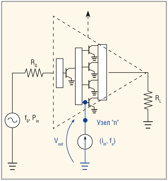 Описываемый метод базируется на идентификации нулей и полюсов. Преимущество метода заключается в том, что одну и ту же методику можно применять для анализа систем с постоянным током, а также для анализа устойчивости при маломощном и мощном сигналах, основываясь на результатах симуляций, полученных средствами коммерческих САПР. На рисунке 1 показан источник синусоидального тока, соединённый с выбранным узлом цепи для анализа устойчивости, где f0, Pin – частота и мощность генератора, RG – внутреннее сопротивление генератора, RL – сопротивление нагрузки, Vout – выходное напряжение, iin, fs – ток и частота источника синусоидального тока.