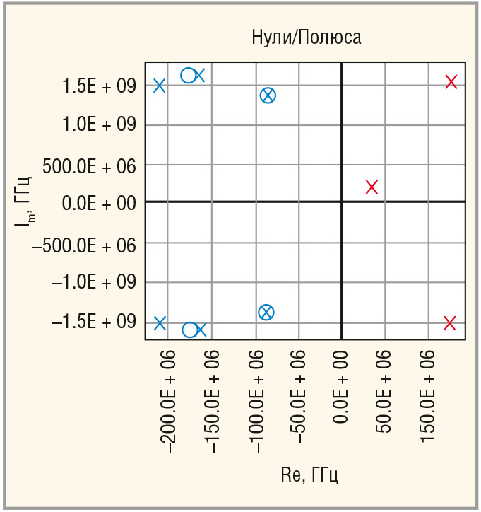 Вторым шагом является определение частотной характеристики цепи, получение передаточной функции и соответствующих ей нулей и полюсов. Этот шаг выполняется с помощью инструмента STAN, который на основе текстового файла, экспортированного из симулятора цепей, позволяет легко получить и проанализировать результаты. На рисунке 2 продемонстрирована карта нулей и полюсов, где – полюса; – нули, а красным отмечены полюса с положительной реальной частью, означающие наличие колебаний на данных частотах.